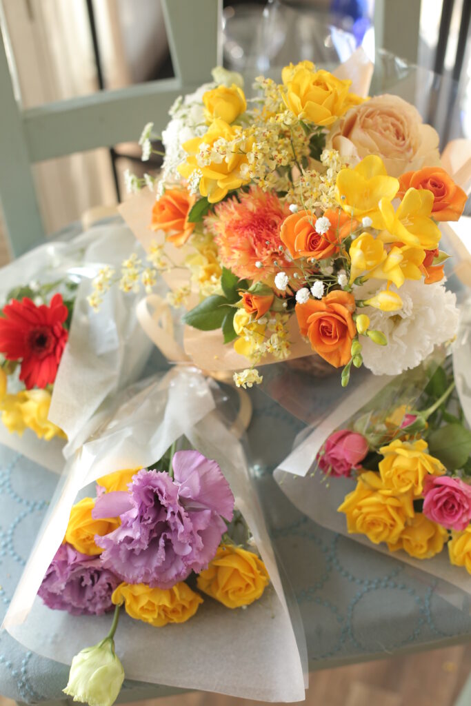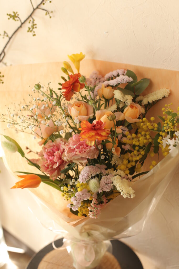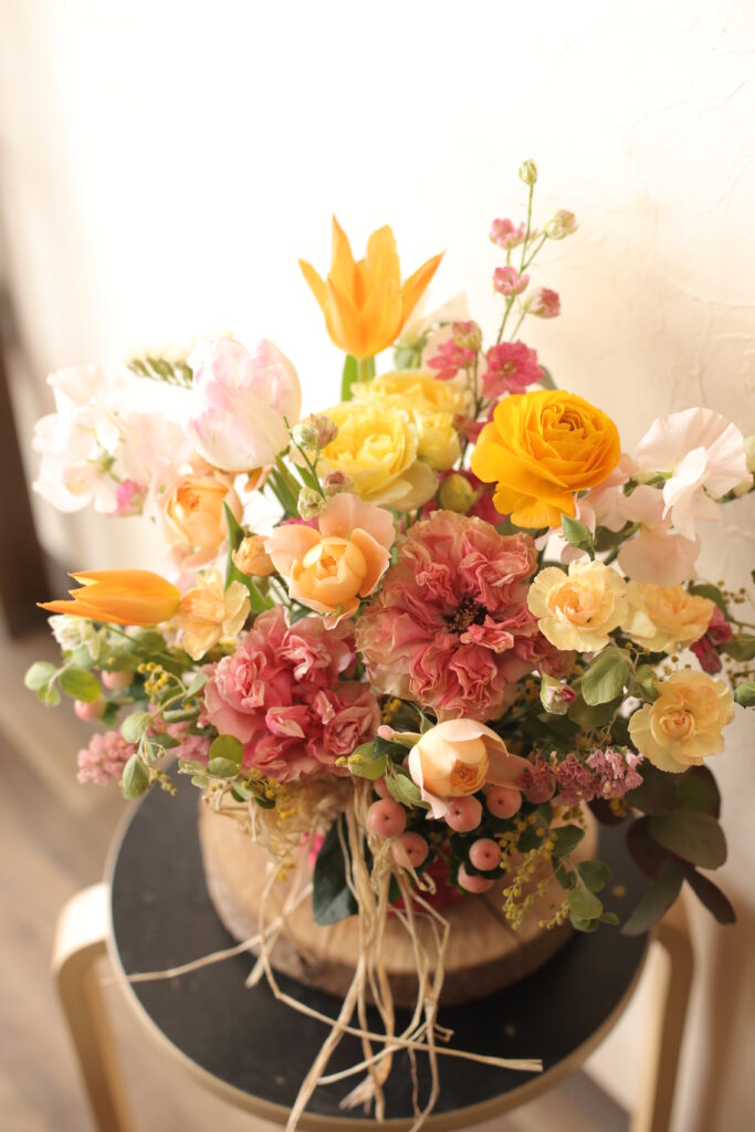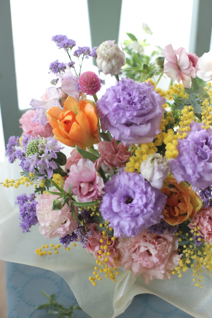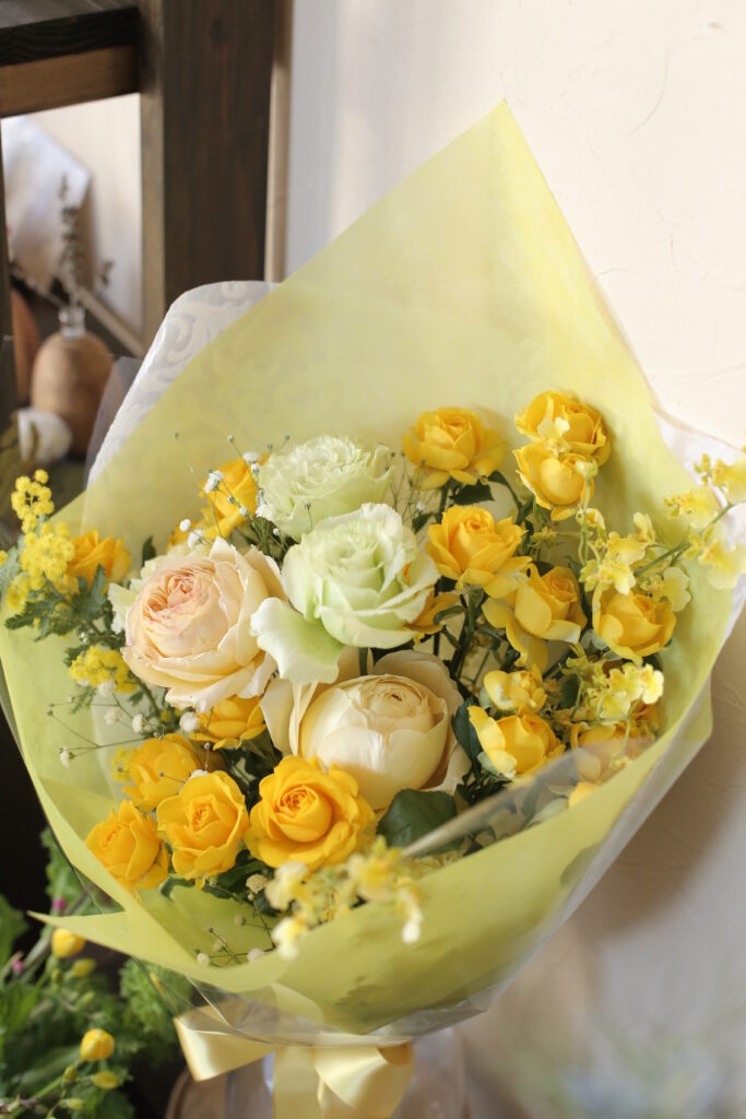 春は 明るい感じで! とのオーダーが圧倒的に多いです。明るいイメージの代表 黄色系ですが、合わせる色によって雰囲気も変わってきます